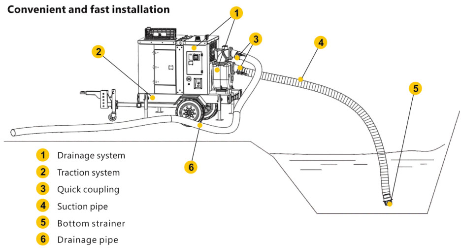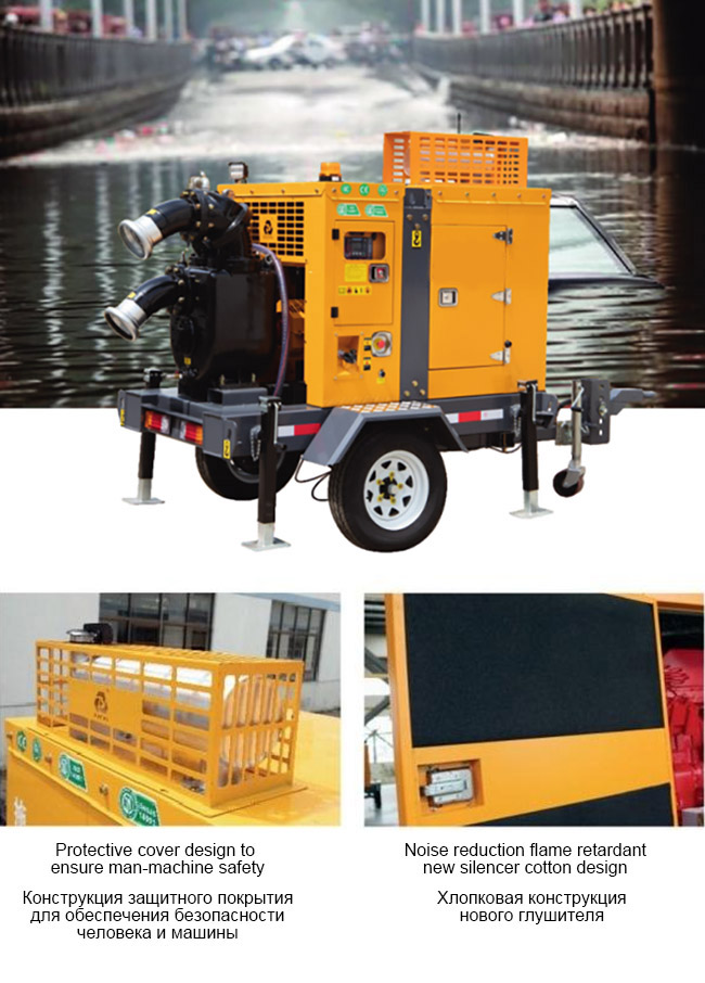 La bomba de motor diésel de remolque tipo fotovoltaico de alta calidad de ZEN Machinery es adecuada para drenaje de campo sin electricidad; Sistema amplificador de vacío incorporado, no es necesario llenar el cuerpo de la bomba con agua. Puede comenzar a drenar rápidamente después del inicio; sistema para remolque de carretera, velocidad: 40 - 80 km/h; El tanque de combustible incorporado en el chasis puede funcionar de 8 a 10 horas.