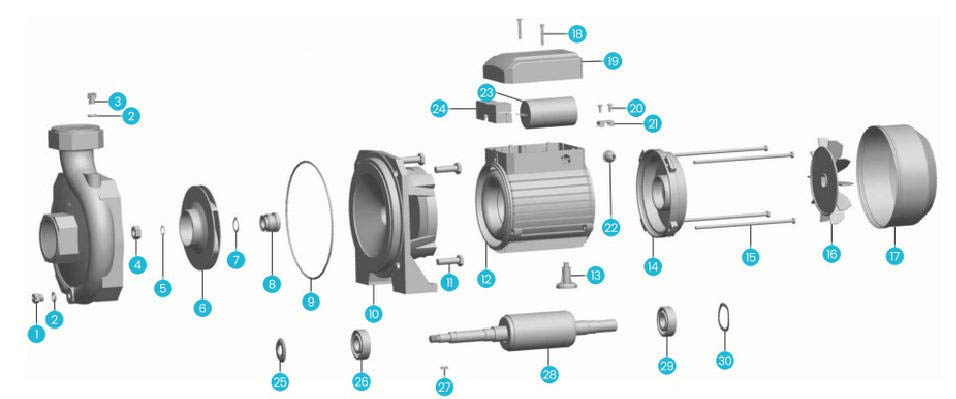 | 8 | Sello mecánico | 18 | Pestillo | 28 | Rotor | ||||||