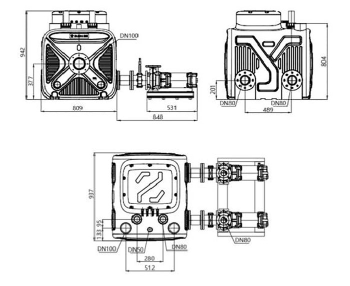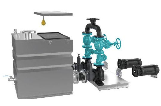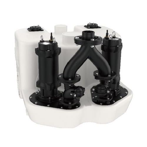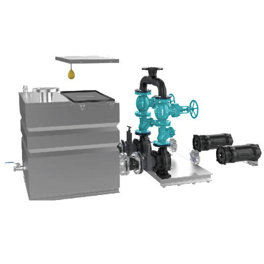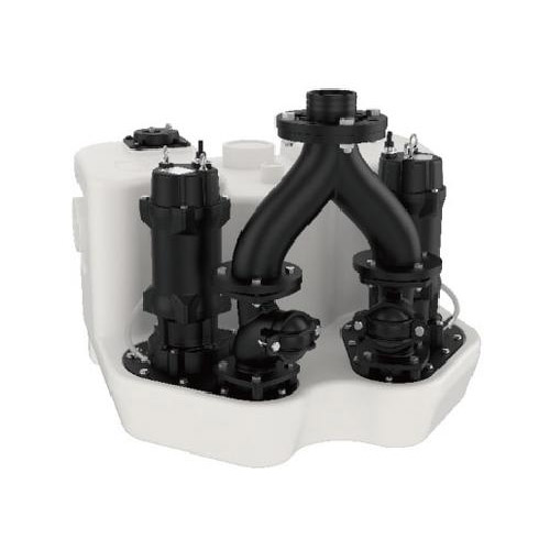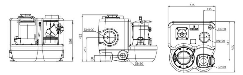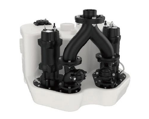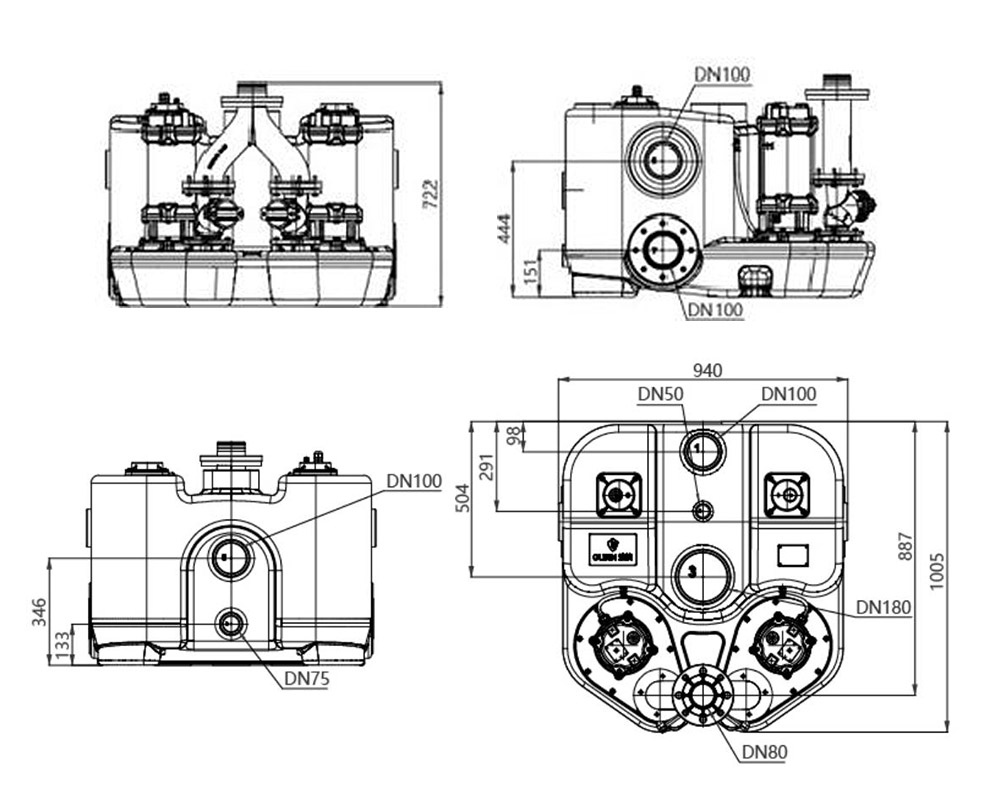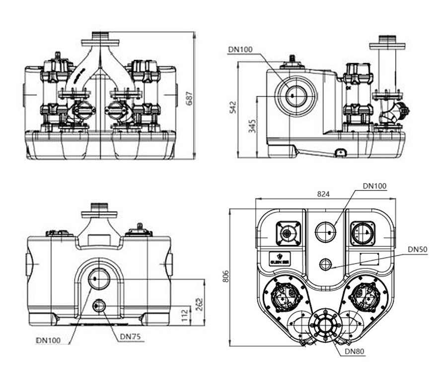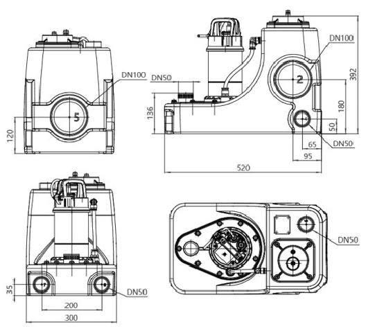 La estación elevadora de bomba de aguas residuales WL 40L-500L tiene tres aberturas de entrada de agua DN100, cuatro aberturas de entrada o mantenimiento de agua DN50 y una salida DN50.