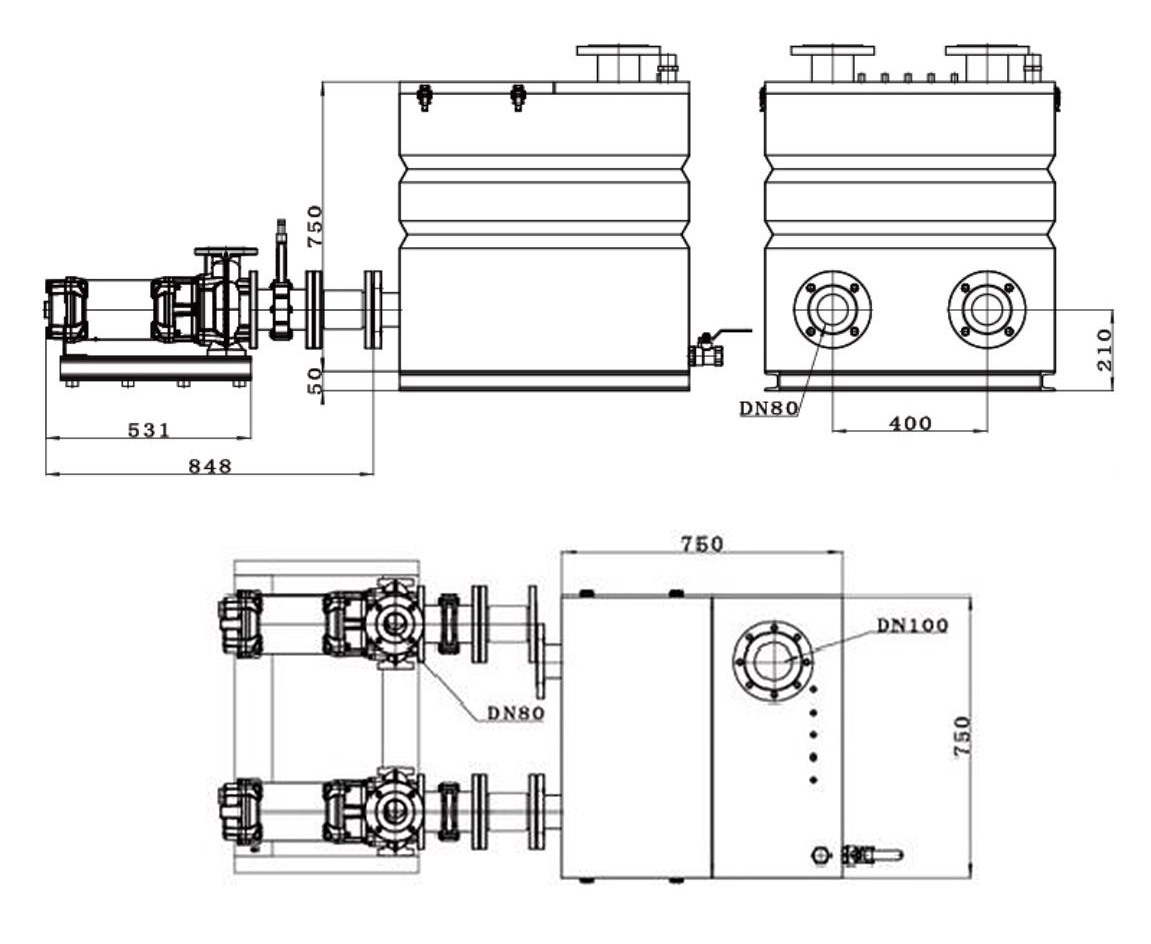 WL - 500L tiene tres entradas DN100 y una salida DN80. La parte superior está equipada con un puerto de escape DN50. El nivel del agua se controla mediante sensores de doble flotador. Personalizar la caja de control para colgar en la pared con una pantalla LED china puede realizar más funciones, como protección del motor y advertencia de fallas. Conectando el mismo depósito de agua se puede conseguir un mayor volumen.