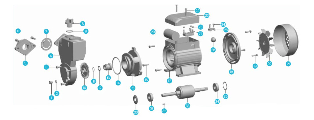 | 9 | Anillo "O" | 21 | Cubierta del ventilador | 33 | Rotor |