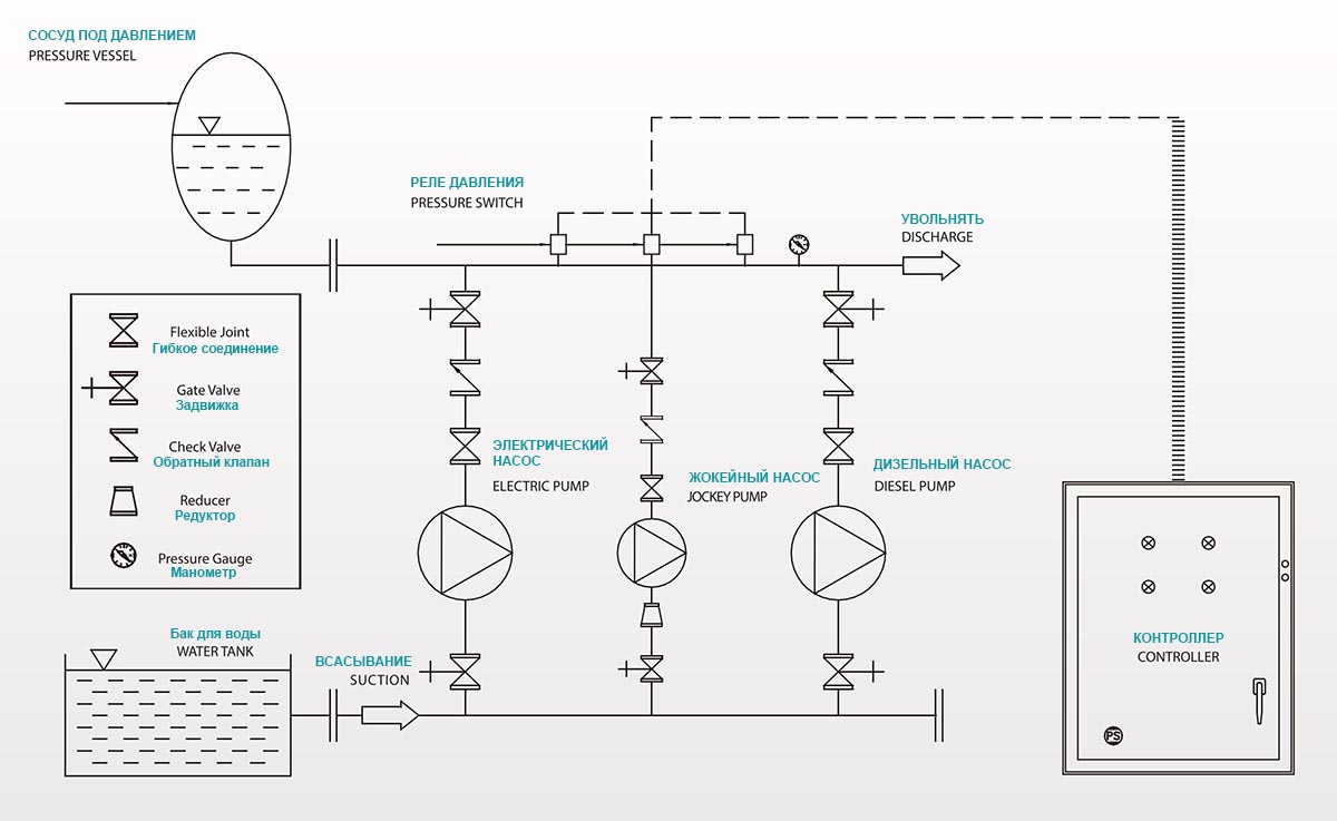 Cuando la presión cae por debajo del valor establecido, el jockey comienza a funcionar con la señal del interruptor de presión y continúa funcionando durante 10 minutos hasta que la presión del sistema alcanza el valor establecido. Si la presión continúa cayendo, primero comienza a funcionar la bomba principal. Si la presión del sistema no puede suministrarse y la presión continúa cayendo, la bomba de reserva comienza a funcionar.