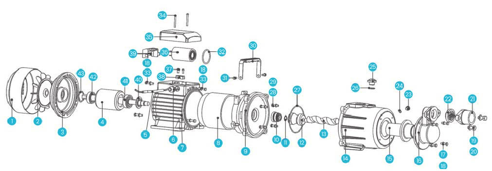 | 5 | cable electrico | 16 | Tapa de la carcasa de la bomba | 27 | Anillo "O" | 38 | Prensa de cables | |||||||