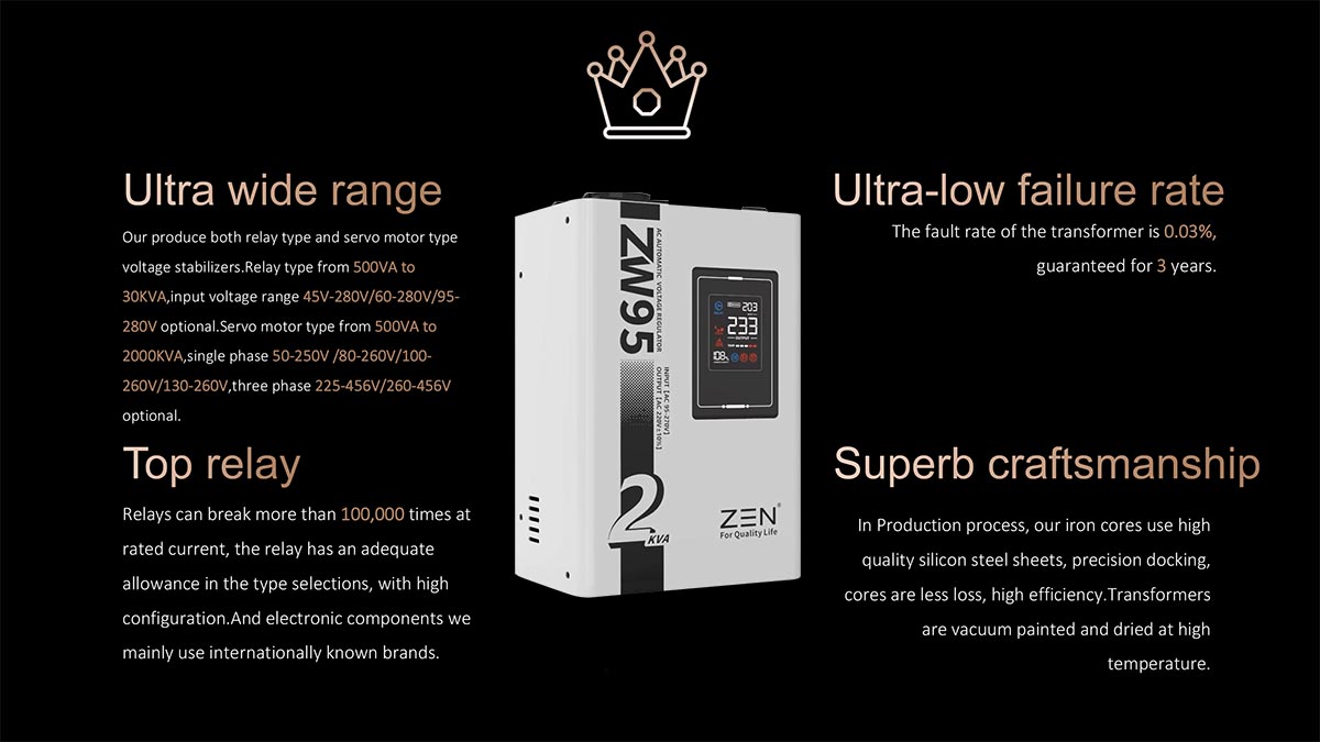 Las marcas de reguladores automáticos de voltaje de CA ZW95 de 1 KVA a 30 KVA de alta calidad de la fábrica ZEN Machinery son conocidas por su alta calidad y confiabilidad, lo que las convierte en una opción popular para aplicaciones residenciales e industriales. Características del productoEste modelo es un pequeño regulador de voltaje de 220 V totalmente automático diseñado para pantallas digitales LED portátiles. Tiene las características de tamaño pequeño, peso ligero, ajuste rápido de voltaje, sin distorsión de forma de onda, etc.